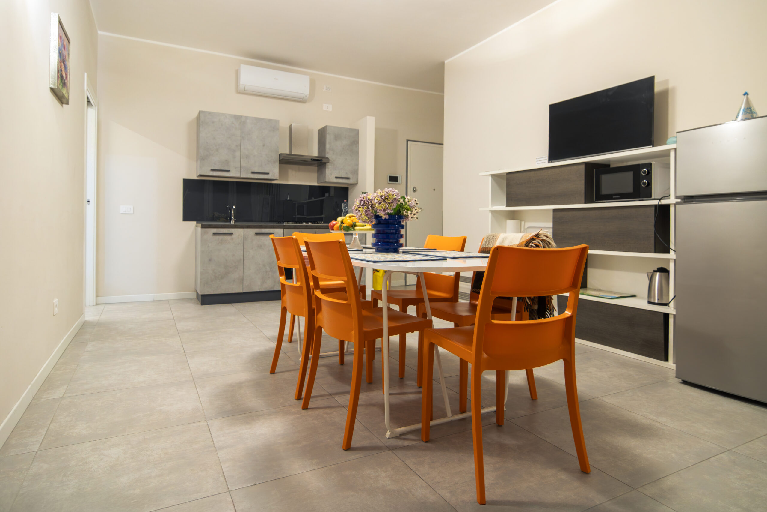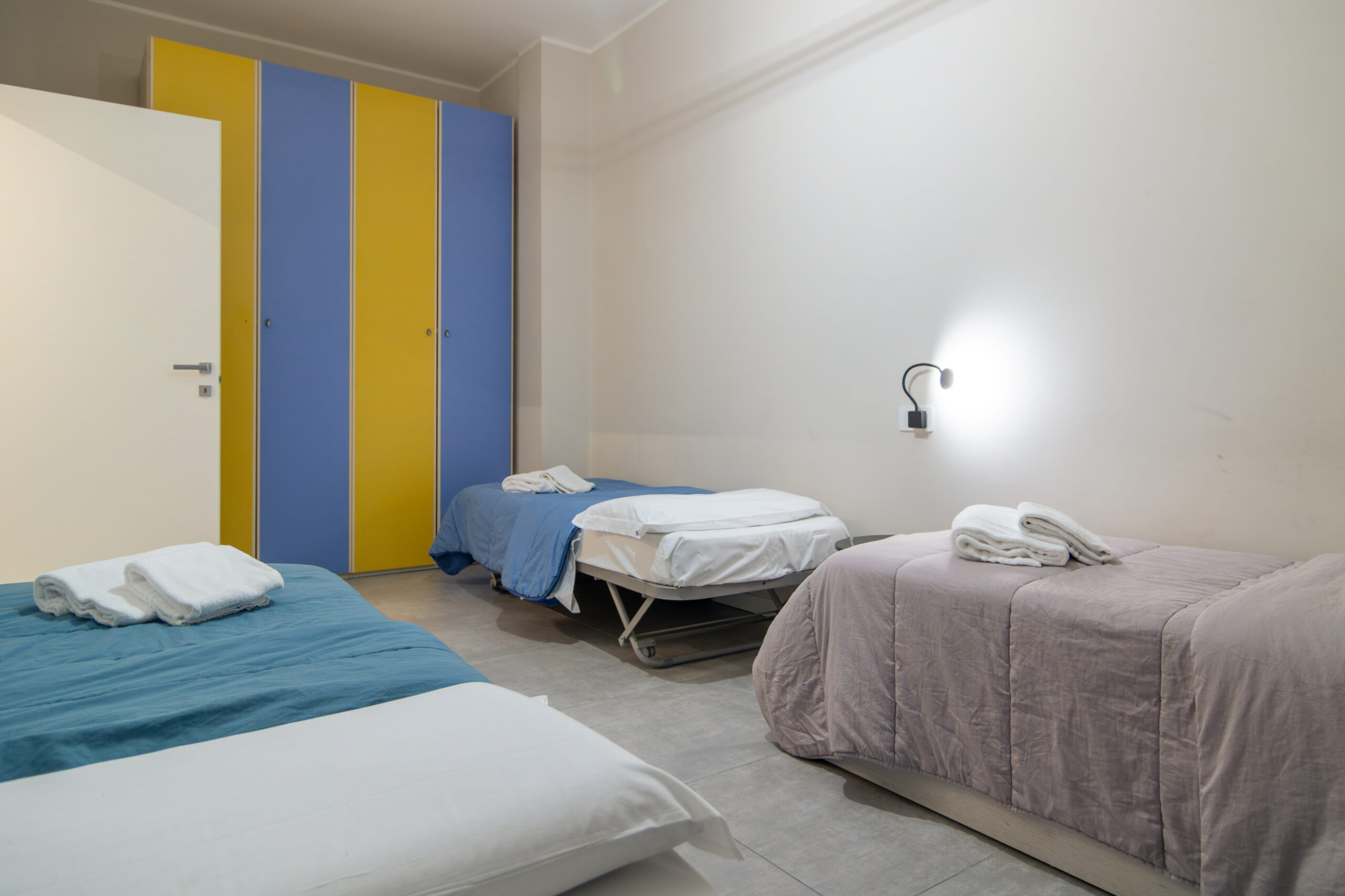 Formula trilocale composto da 2 camere da letto per un totale di 6 posti dislocati in 4 letti singoli ed un matrimoniale, bagno finestrato con doccia, cucina/sala abitabile ed accessoriata, balconi su entrambi i lati dell’appartamento.